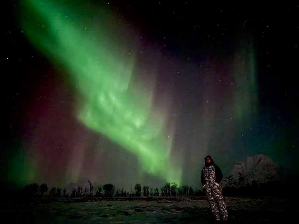 Als wir gestern unsere Füße hochlegen, diskutieren wir noch einmal unsere weitere Route und planen Tag 12 und 13 spontan um. Gerade noch rechtzeitig. Denn während wir umbuchen, stellt sich heraus, dass wir für die Unterkunft an Tag 12 eine Stunde später den vollen Preis als Stornogebühr hätten zahlen müssen. So erwartet uns nun morgen eine andere, hoffentlich spannendere Route als ursprünglich geplant, auch wenn das einiges an Mehr-Kilometern bedeuten wird. Wir essen anschließend in Ruhe zu Abend und räumen gerade ein wenig auf, als am Himmel plötzlich graue Schleier auftauchen. Aus Erfahrung wissen wir, dass diese grauen Schleier am sternenklaren Himmel nur eins bedeuten können: Polarlichter! Wir ziehen uns richtig dick und als wir nach draußen treten, geht es schon los. Schnell klettern wir noch den Hügel hinter unserem Haus hinauf (der Hof ist durchgängig beleuchtet und Licht stört die Sicht auf Polarlichter enorm), als der Himmel voll durchlädt. Ein Feuerwerk an Farben und Formen findet genau über unseren Köpfen statt, wir sehen grüne, rote, gelbe, lila und rosa Farbschleier. Dank unserer Schneeanzüge und ordentlich warmer Kleidung darunter stehen wir über zwei Stunden bei -10 Grad draußen und können es gar nicht fassen. Zur Krönung sieht Katrin die klarste Sternschnuppe ihres Lebens und ist endgültig beseelt.Die Lyngen Alpen haben mal wieder voll abgeliefert. Dieser Ort ist einfach magisch.