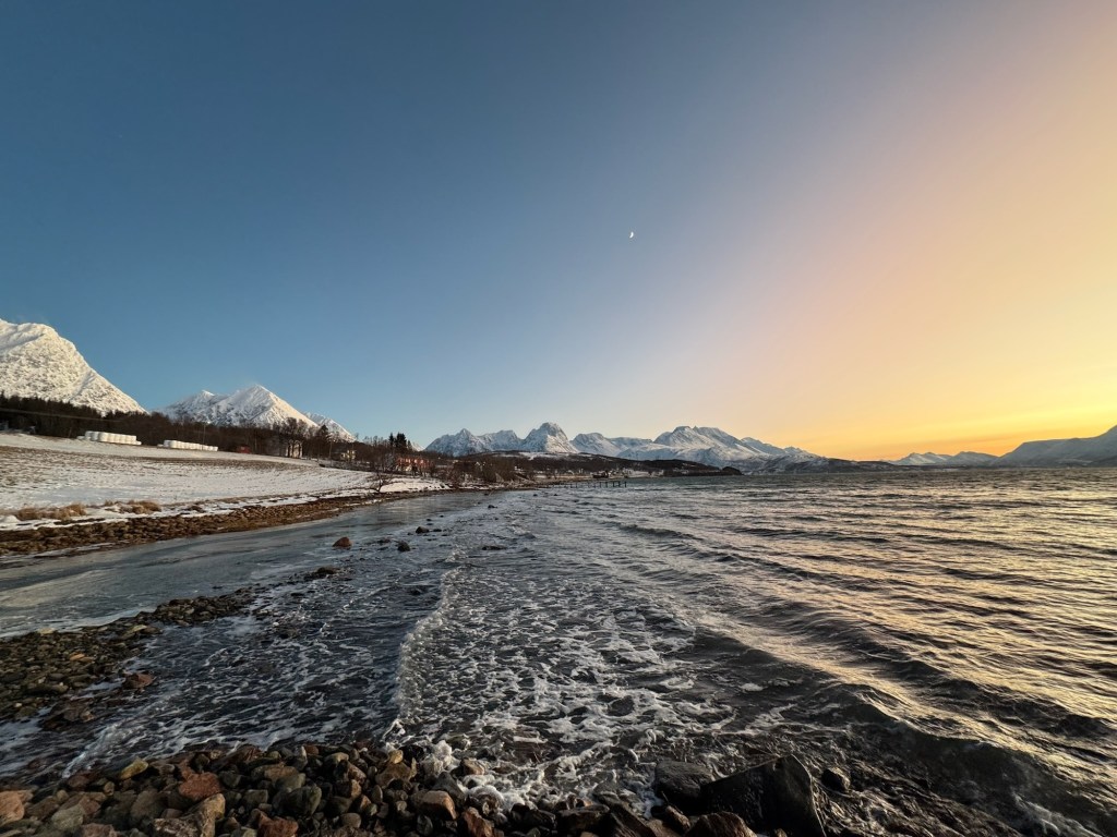 Zufrieden fahren wir im Anschluss wieder über die 91 zurück, parken den Volvo am Haus, versorgen ihn mit Landstrom und gehen runter an den Fjord, um die letzten Momente Abendröte zu genießen. Um 15:30 Uhr. Schon ein bisschen komisch. Aber: Wir haben wieder mehr Tageslicht. Unsere Route führte von Alta aus südwärts und das bedeutet, dass wir mit jedem Kilometer mehr Tageslicht gewinnen – von gestern auf heute, waren es in Svensby selbst schon 10 Minuten plus. Ab jetzt bekommen wir also wieder mehr Blick auf all das Schöne, um uns herum.