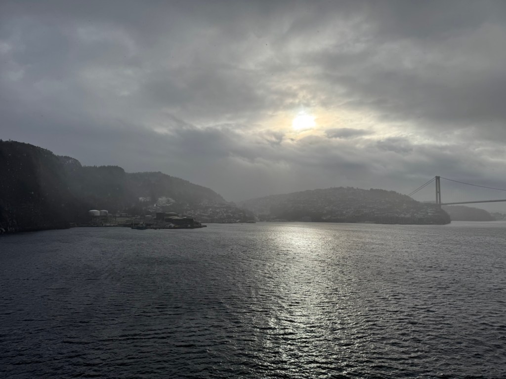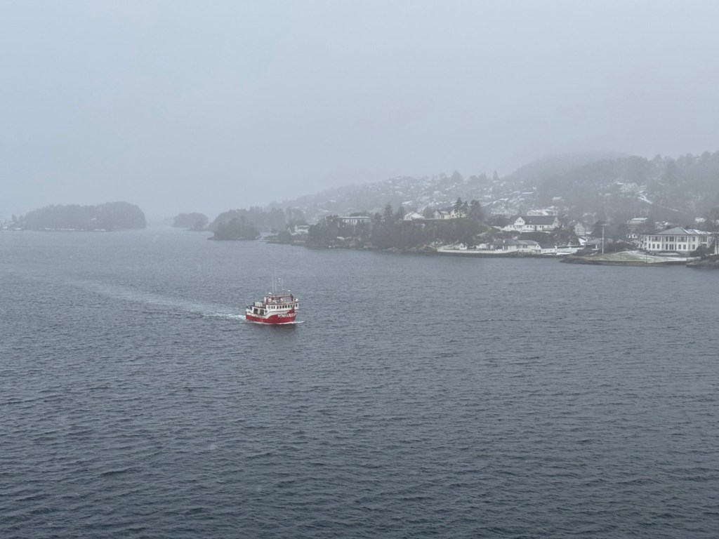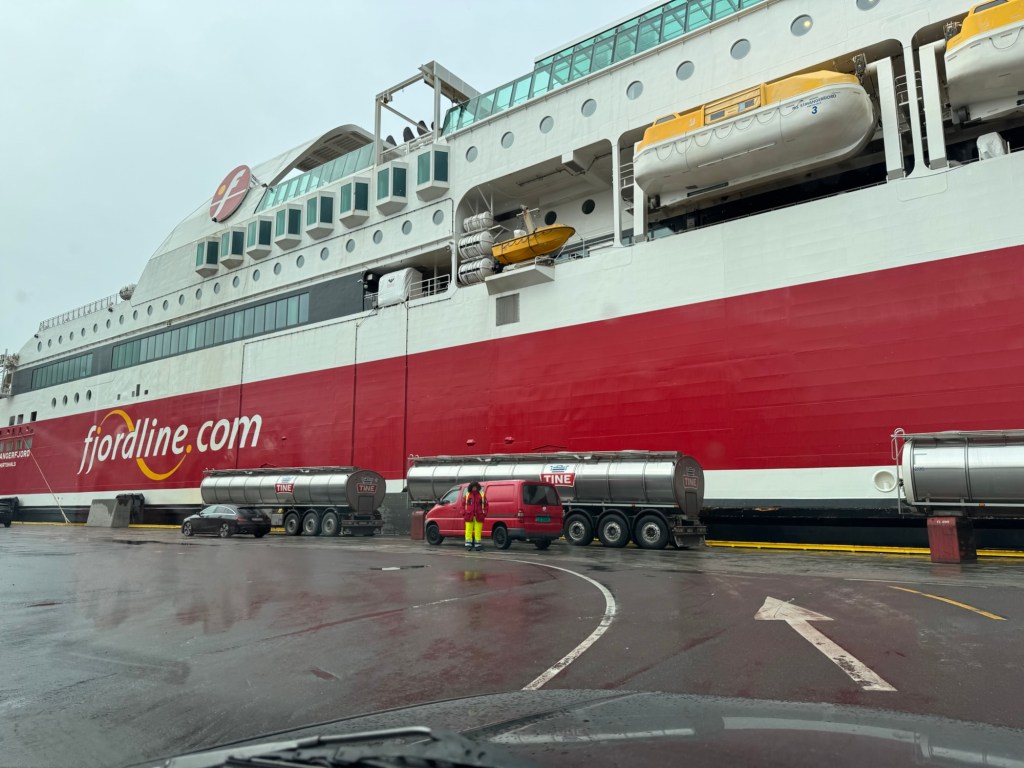 Wir streifen eine gute Stunde durch das Viertel, kehren anschließend in unser Hotel zurück, sammeln unser Gepäck ein und checken aus. Im Schneegestöber verlassen wir die Tiefgarage und fahren zum drei Kilometer entfernten Hafen. Dabei drücken wir uns selber die Daumen, dass das mit der Fährfahrt klar geht. Kurzes Anstehen, dann können wir einchecken. Nach nochmaligem Warten fahren wir an Bord der MS Stavangerfjord, unserer mobilen Unterkunft für die nächsten 18 Stunden.