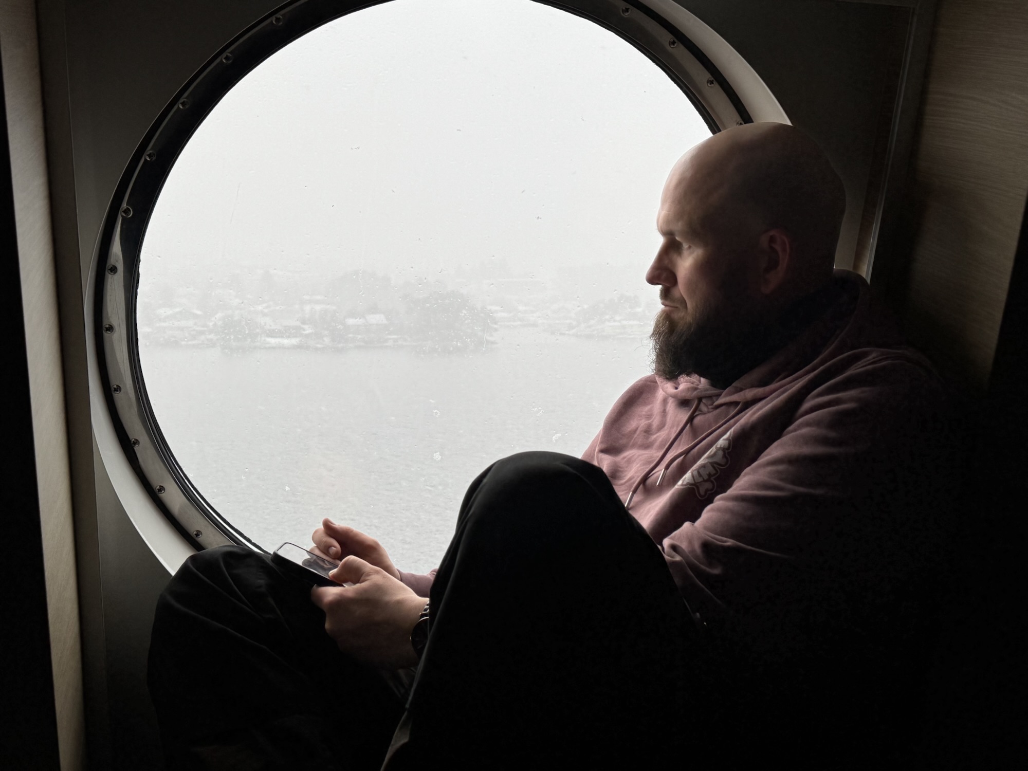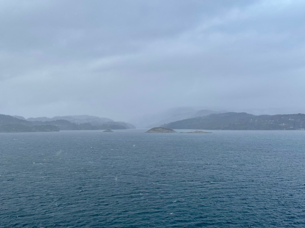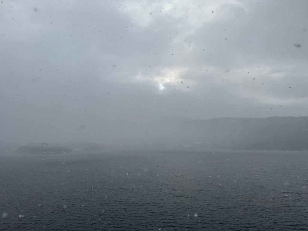 Den Rest des Tages lungern wir rum. Die Fahrt durch die Fjorde ist nur halb so spektakulär, wie sie sein könnte. Zum scharfen Wind und dichten Schneegestöber gesellt sich auch noch unser alter Freund Nebel. Ist klar, dass der uns noch verabschieden muss. Wir nehmen ihn so wie er ist, undurchdringlich und unberechenbar und machen das Beste daraus.