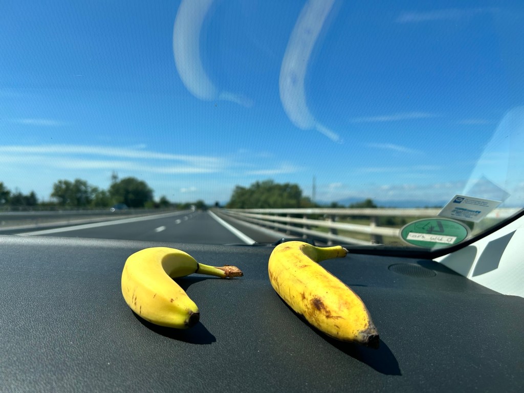 Ohne nennenswerte Besonderheiten passieren wir den Taunus, wechseln kurz vor Frankfurt auf die A67, kurz darauf auf die A5. Wir steuern regelmäßig die Autohöfe an in der Hoffnung, etwas zum Frühstück zu bekommen – leider haben alle Restaurants noch geschlossen. Also ziehen wir bis zum Mittag durch und halten erst gegen Mittag am Autohof Europapark um dort etwas ordentliches zu essen. Kurz hinter Neuenburg am Rhein tanken wir kurz und wechseln dann auf die A36. Mit ihr überqueren wir den Rhein und sammeln damit den ersten Länderpunkt dieser Tour.