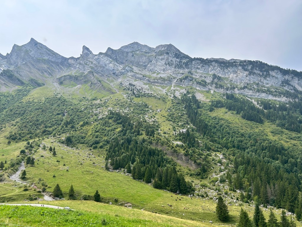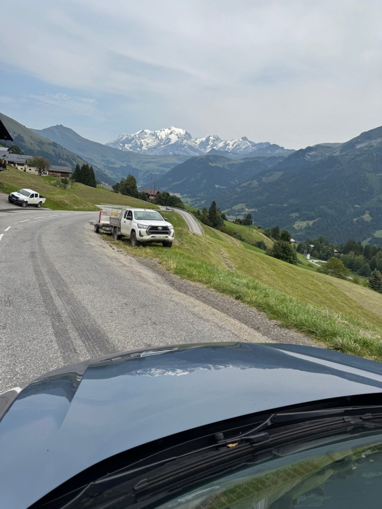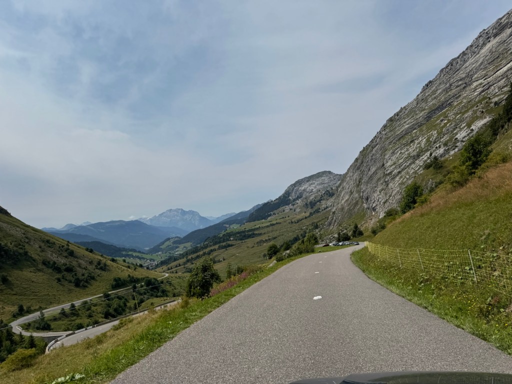 Mit dem Col de Saisies schließt sich ein Pass an, der seinem Namen dem gleichnamigen Skigebiet verdankt. Oder ist es andersherum? Wie auch immer, landschaftlich durch Lifte und Abfahrten eher anstrengend, so ist auch die touristische Auslastung der Region deutlich zu merken. Hier ist alles voll, viele Menschen, viele Autos, viele Hotels, viele Shops, viel von allem. Umso erstaunlicher die Auf- und Abfahrt. Aus irgendeinem Grund leer, kaum Autos oder Fahrräder, und ein Asphaltband, dass genau mein Bockzentrum trifft: rauher, immer wieder geflickter (hervorragend geflickter) Belag, der in schnellen Kurven die Bergwand entlang rast um für enge und steile Serpentinen abzubremsen während der Fahrbahnwinkel mal nach rechts oder links wegkippt. Dürfte ich mir für den Rest meines Lebens eine Art Bergstraße aussuchen, diese wäre es. Es ist diese Mischung aus Anspruch, Sportlichkeit und Flow, die solche Abschnitte besonders macht. Begleitet wird das Ganze heute von Techhouse aus den Boxen, der Fahrtwind bläst durchs offene Fenster ins Auto, ein Träumchen.