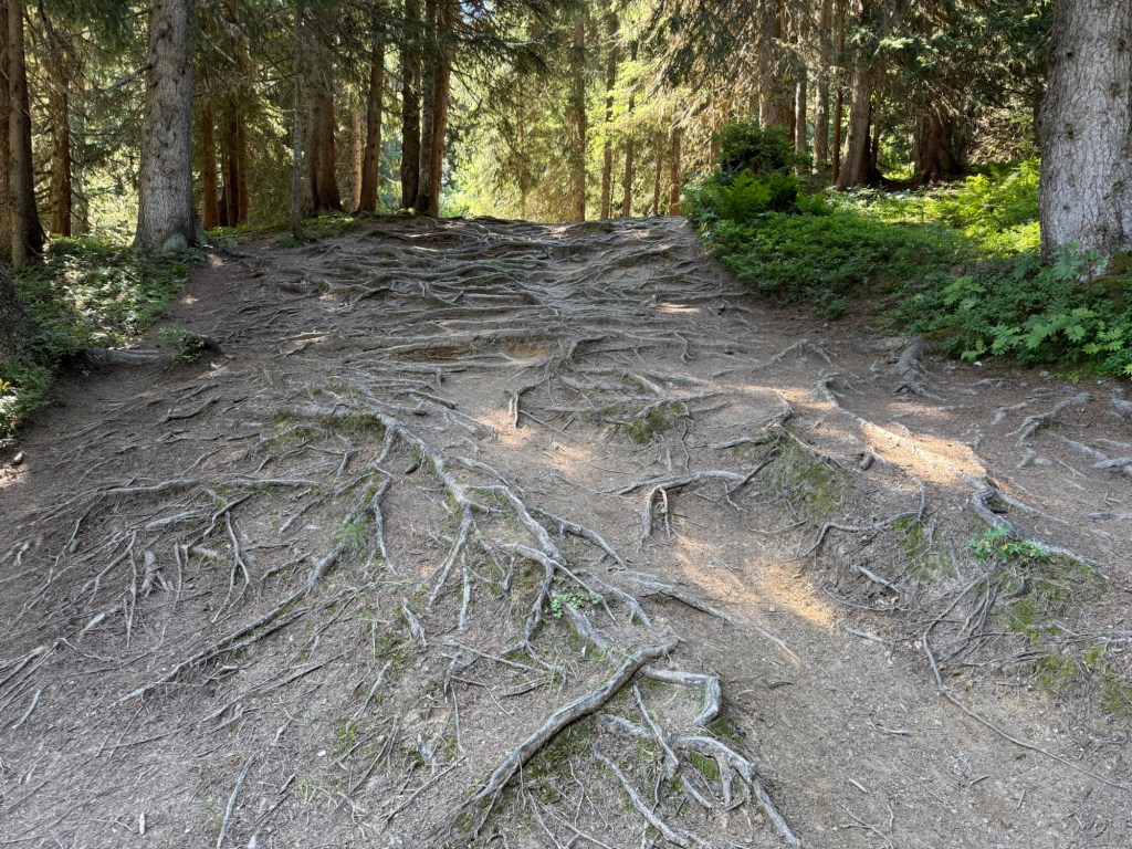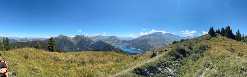 Also drehen wir um und haben am Ende auf diese Weise ca. 1,5 Kilometer auf unsere Wanderroute addiert. Das war natürlich geplant, dieser kurze Ausritt war natürlich zum Muskel aufwärmen. Zurück am Col du Pré nehmen wir diesmal den richtigen Weg und steigen ebenfalls durch den Wald aber diesmal steil und über ausgewaschene Wurzeln bergan. Durch die Bäume erahnen wir immer wieder die beiden Motive der Wanderung: unten glitzert das tiefe Blau des Lac de Roselend, dadrüber funkelt der Mont Blanc. Und eigentlich gibt es noch ein drittes Motiv, das neben den beiden anderen fast ein wenig untergeht: 360° um uns herum ist bestes Alpenpanorama. Berge und Weite in jede Richtung.