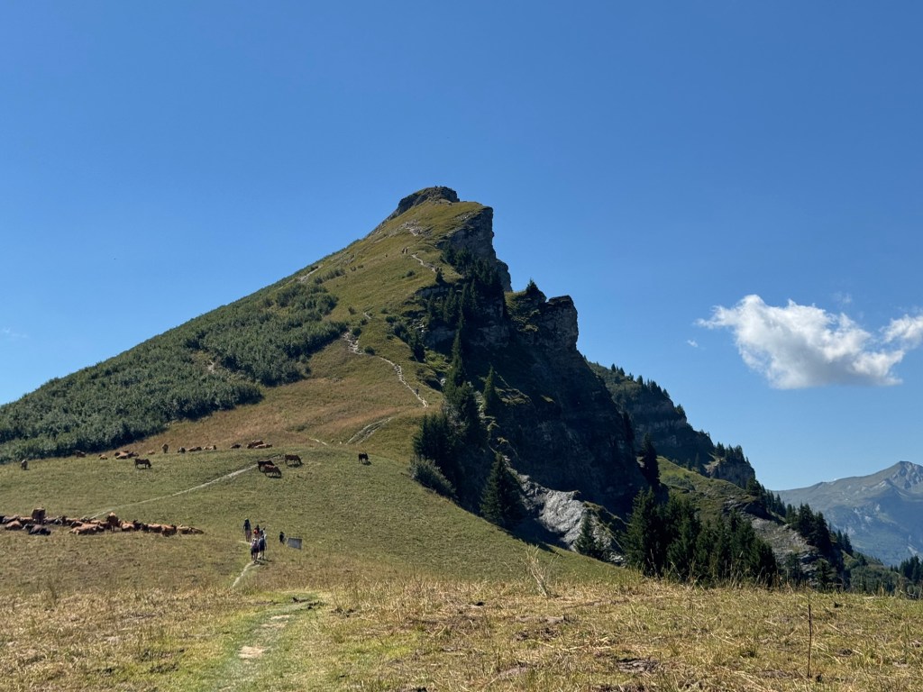 Über einen langen, schmalen Grat laufen wir über das Roche Partir-Massiv, zwischendurch mit sehr genauem Blick dafür, wo wir unsere Füße aufsetzen. Um uns herum ist eine Kuhherde, schätzungsweise 30-40 Tiere denen die Wildkräuter offenbar hervorragend schmecken. Und das führt zu überall herumliegenden und der Umgebung einen deutlichen Duftstempel aufsetzenden Hinterlassenschaften.