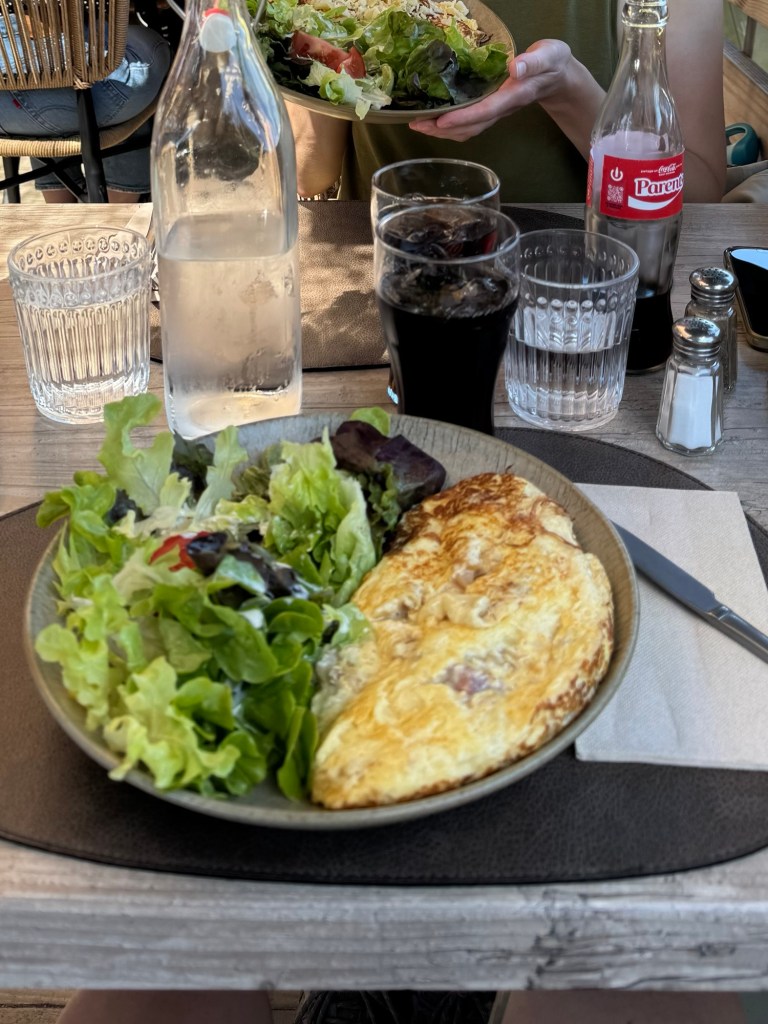 Anders als unten im Tal hat die Lokalität auf dem Pass durchgehend warme Küche, wir finden einen schönen Platz auf der kleinen Terrasse mit Blick auf den Stausee und den Mont Blanc, lassen uns die Karte bringen und entscheiden uns für Omelette. Einmal mit Beaufort-Käse und einmal mit Beaufort-Käse, Zwiebeln und Speck. Wir wissen nicht genau, womit wir rechnen müssen und spekulieren noch auf Crêpes oder Creme Brulee als Nachtisch bis unser Essen kommt. Die Omelettes sind aus locker 5-6 Eiern gemacht und ordentlich gefüllt. Und fluffig – ich glaube, so fluffige Omelettes habe ich noch nie gegessen. Dazu gibt es eine stabile Menge Grünzeug, die Gesundheit soll ja nicht zu kurz kommen.
