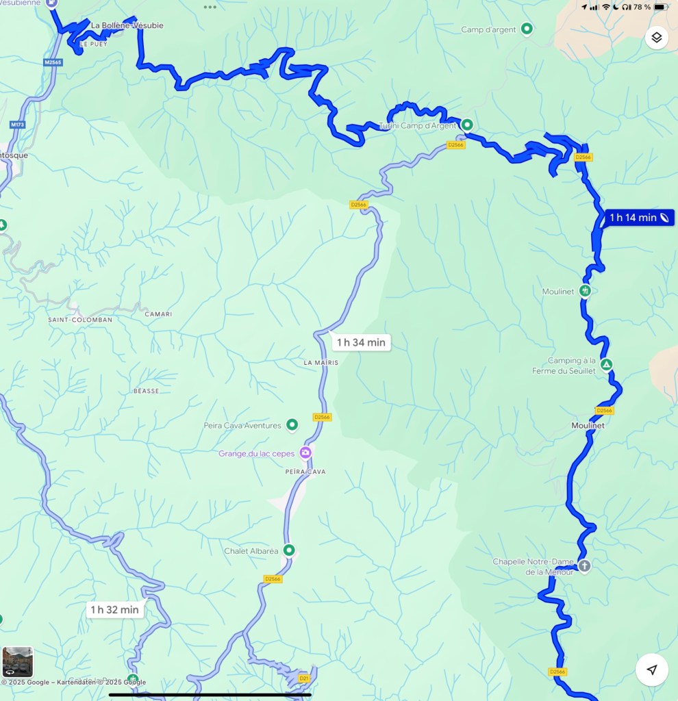 Wir starten den Tag völlig entspannt. Gestern Abend ist uns noch aufgefallen, dass unser am Reissbrett gemachter Plan nicht aufgehen wird. Aus irgendeinem Grund haben wir für morgen eine 300+ Kilometer-Etappe inklusive sechs oder sieben Pässe eingeplant. Das war dumm, das bedeutet nur Stress. Also haben wir gestern Abend heute noch umgeplant, die lange für heute geplante Wanderung gestrichen und gegen eine zwei Stunden-Tour getauscht und in Sospel hinter dem Col de Turini ein AirBnB gebucht. Campingplätze gibt es auf der Strecke kaum und wenn dann haben sie vernichtende Bewertungen.