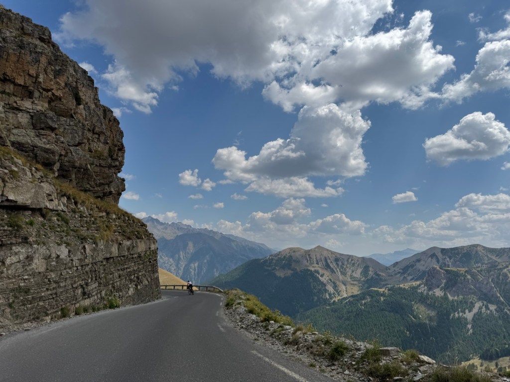 Die Landschaft oben auf der Passhöhe ist außerirdisch, es gleicht einer verlorenen Mondlandschaft. Wir haben ausreichend Zeit, das Szenario zu betrachten, die Strecke führt über lange relativ flache Graden an der Berflanke entlang. Drei Kilometer hinter dem Col de la Bonette passieren wir den Col de Raspaillon (2513m), auf 2271 Metern passieren wir das Camp des Fourches, hier kraxelten Katrin und Micha gemeinsam mit mir bereits auf der 2020er Lost in the Alps durch die Ruinen und störten das französische Militär. 1890 wurde der Ort noch als Biwakplatz genutzt, zwischen 1896 und 1910 wurden hier 26 Hütten errichtet, die so ausgestattet waren, dass das Camp sich autark versorgen konnte. Die Strecke ist immer noch recht gradlinig, aber häufig auf Grund der Topographie schwer einzusehen. Was die Sportwagen-Treter bergauf vormachten, machten diverse Moppedfahrer (gendern ist hier unnötig) jetzt nach. Obwohl ich auf Pässen bei jeder Gelegenheit Motorrädern Platz mache und sie vorbeiwinke, ballerten hier ganz Horden gleichzeitig durch den Gegenverkehr. Mehrfach fehlten auch hier nur wenige Zentimeter um mehreren Menschen den Tag nachhaltig zu versauen. Ironie: auf der Abfahrt sind aktuell diverse Baustellen wo die Straße einspurig und durch Ampeln geregelt ist. Hier trafen wir dann wieder auf die Lebensmüden, grade mal ein oder zwei Autolängen vor uns.