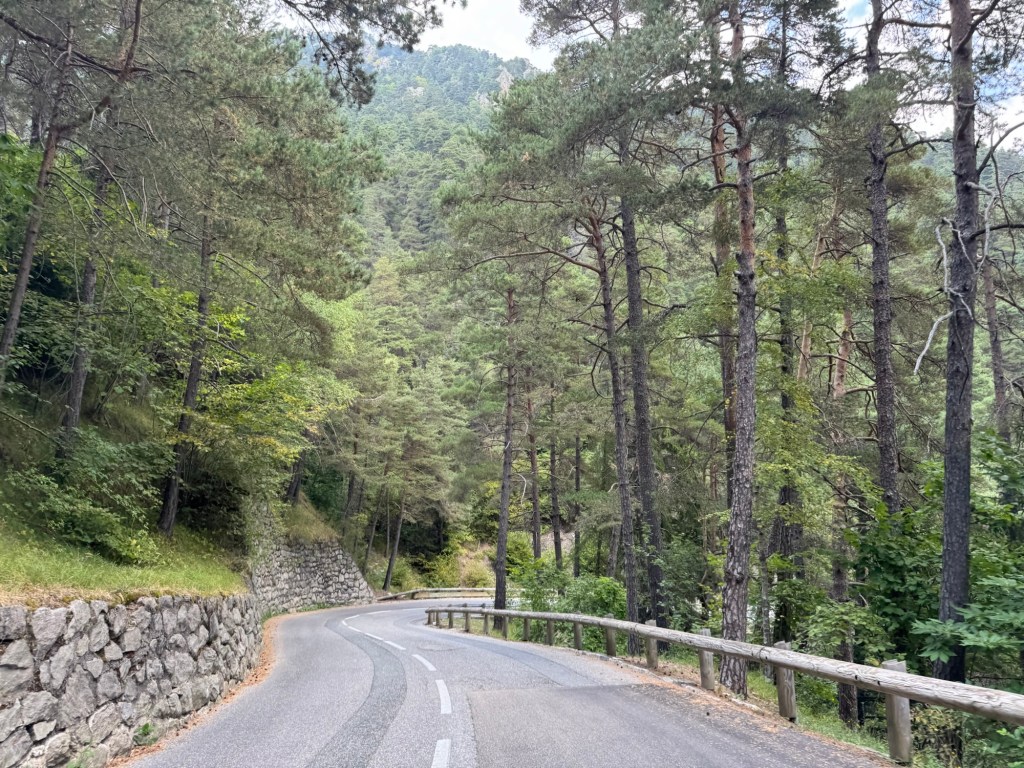 Hinter dem Pass geht es durch den Parc National du Mercantour. Hier wurden im Vallée des Merveilles (Tal der Wunder) und im Vallée de Fontanalbe (Tal der weißen Quelle) über 35.000 Felsritzungen aus der Bronzezeit gefunden. Außerdem wachsen hier über 2000 Pflanzenarten, 40 davon endemisch. Nennenswert ist dabei die Saxifraga Florulenta, eine Steinbrecherart die nach ca. 30 Jahren ein einziges Mal blüht und dann abstirbt. Hört sich für uns nicht nach einer Erfolgsgeschichte an, hält sich aber trotzdem bis heute. Außerdem leben hier Gämsen, Alpensteinböcke, Steinadler, Bartgeier, Murmeltiere, Mufflons, Auerhähne und ein paar aus Italien eingewanderte Wölfe. Natürlich sehen wir von der Straße aus nichts davon, was wir aber sehen ist unglaublich dichte und wilde Natur jenseits des Asphaltbandes. Den Weg gibt der Tinée vor, er hat eine tiefe Schlucht in die Felsen gegraben und diese nutzt die M2205C für ihren Weg in Richtung Süden. Aus dem Vallée de la Tinée zweigen wir ab auf die M2565 die gleichmäßig bis nach Valdeblore hoch führt. Durch dichten Wald fahren wir bis zum Col Saint Martin. Hinter diesem folgen wir dem Boreon, einem klitzekleinem Flüsschen dessen gigantisches Bett aber auf die im Frühjahr hier abfliessenden Wassermassen schliessen lässt.
