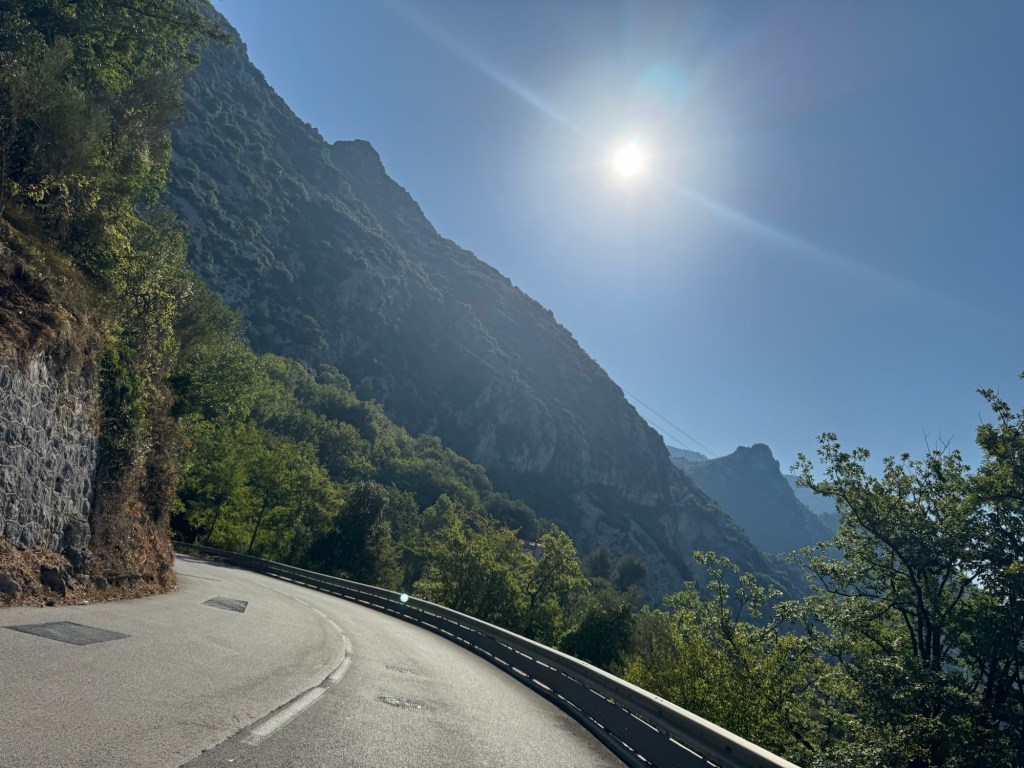 Ehrlicherweise: den hätte man sich aus jeder Perspektive sparen können. In Mini-Pass auf 700undeinbisschen Metern, unspektakulär und fast schon normal. Aber es ist der letzte Pass der Route des Grandes Alpes und es hätte sich falsch angefühlt, ihn nicht zu fahren. Nach diesem kleinem Ausflug kommen wir an der Kreuzung, an der wir vorhin wieder gedreht haben an und sind damit fertig mit der Route. Klar, formal geht sie noch bis Menton fast ans Meer, das schenken wir uns aber. Wir haben wenig Lust, nur aus Jux und Dollerei in die wuselige Stadt zu fahren.