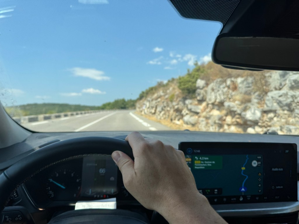 Und so spulen wir das ab, was wir hier erwartet haben: chaotischen Verkehr unterbrochen von Mautstationen. Das lässt sich nur mit stoischer Gelassenheit ertragen, darin üben wir uns. Im Schnitt kann man sagen: die Italiener:innen fahren alle krass zu langsam, die Monegass:innen alle deutlich zu schnell und die Franzos:innen machen was auch immer sie machen wollen. Ich überlasse einen Großteil der Arbeit dem adaptiven Tempomaten, der kriegt das ganz gut hin.