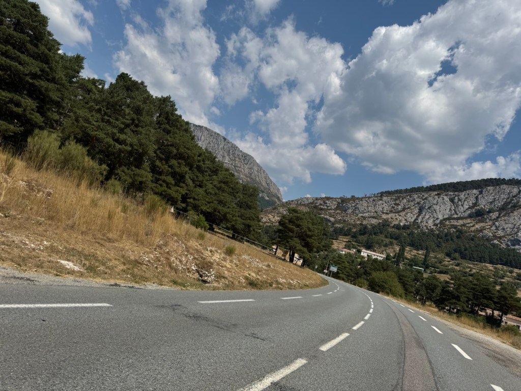 Also klemmen wir uns auf die D6085 und fahren nordwärts. Die Straße ist wunderbar ausgebaut, sehr breit mit Fahrradwegen neben ausreichend breiten Fahrspuren in beide Richtungen. In leichten Auf und Abs mit weiten Schwüngen fahren wir sie entlang, wir haben die Fenster geschlossen und genießen die konstant angenehme Temperatur im Inneren. Die Straße könnte so überall sein, ihr fehlt ein wenig das Besondere. Macht aber nichts, wir sind immer noch stark übersättigt von den letzten Tagen. Und so passieren wir auch mehrere Pässe ohne es zu bemerken. Col du Pilon, Col de la Faye, Col de la Colette, Col de Valiferriére und Col de Luens bemerken wir nur durch die Schilder am Wegesrand, es macht kaum einen Unterschied was die Wegführung angeht.