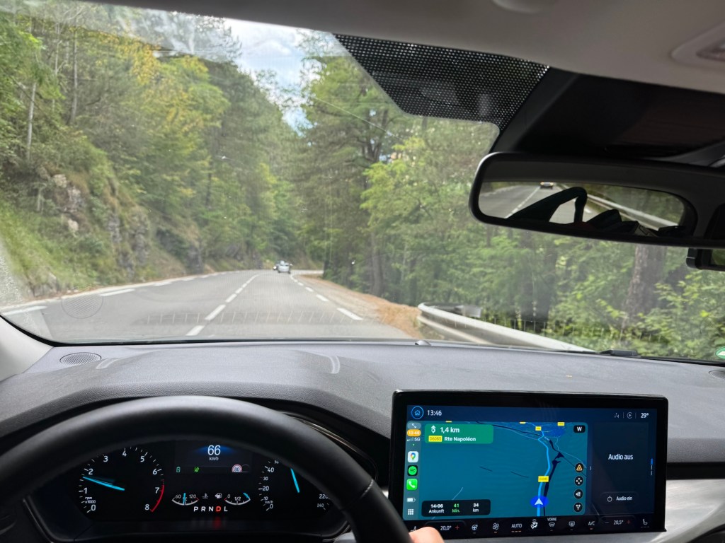 Und so könnte der Tag einfach relativ unspektakulär am gut gekühlten Cockpit des Focus vorbeistreichen, würden wir bei Castellane nicht nach links auf die D902 abbiegen. Und mit ihr dem Verlauf der Verdon folgen, hinein in das von Fluss gegrabene Tal, auch bekannt als Gorge de Verdon, landläufig auch als Grand Canyon du Verdon bezeichnet. Der Canyon ist etwa 21 Kilometer lang und geht von Castellane bis zum Stausee Lac de Sainte-Croix. Neben der Tara-Schlucht in Montenegro (in der Micha und ich 2023 raften waren) ist das hier der größte Canyon Europas.
