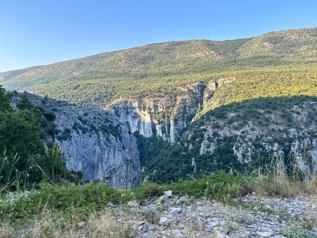 Mit den ersten Sonnenstrahlen verlassen wir den Campingplatz und fahren weiter in die Schlucht hinein. Über die D952 fahren wir bis La Palud-sur-Verdon, einem klitzekleinem Dorf, dort biegen wir auf eine Straße bergauf ab. Die D23 führt dicht an den Berg geschmiegt fast 400 Meter hoch aus dem Tal zu seiner Oberkante. Das Panorama ist beeindruckend, beidseitig schroff abfallende Felswände, darunter der für uns kaum sichtbare Fluss.