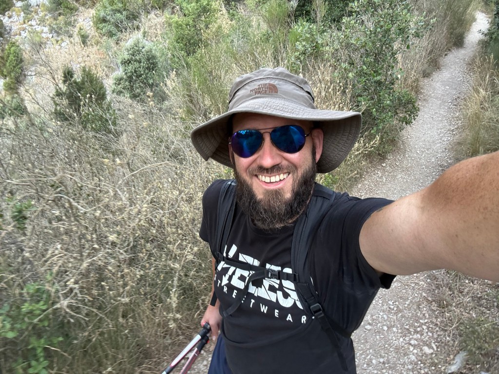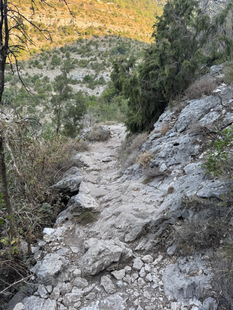 Der Weg runter ist schon eine Herausforderung. Lange, dünne Schotterpfade wechseln sich mit losem Geröll und natürlichen Stein-„Treppen“. Unsere Wanderstöcke geben guten Halt, wir sind sehr froh, die Dinger dabei zu haben. Immer wieder öffnet sich zwischen den Bäumen der Blick in die Schlucht und auf die gegenüberliegenden Felswände. Wir wandern beide jeweils in unserem Tempo, immer wieder warten wir aufeinander.