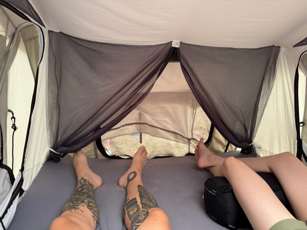 Zeit, aus dem Zelt zu klettern und den schwerwiegenden Fehler auszubügeln, den wir in der Eile beim Start des Unwetters gemacht haben: wir hatten nichts zu snacken mit dabei. Kaubonbons, Chips und Orangina regeln jetzt. Das wird uns bis zum Abendessen tragen das heute noch einmal Nudeln mit Pesto sein wird. Bis dahin legen wir aber ersteinmal unsere Füße hoch. Endlich. Weil Zelt zählt nicht.