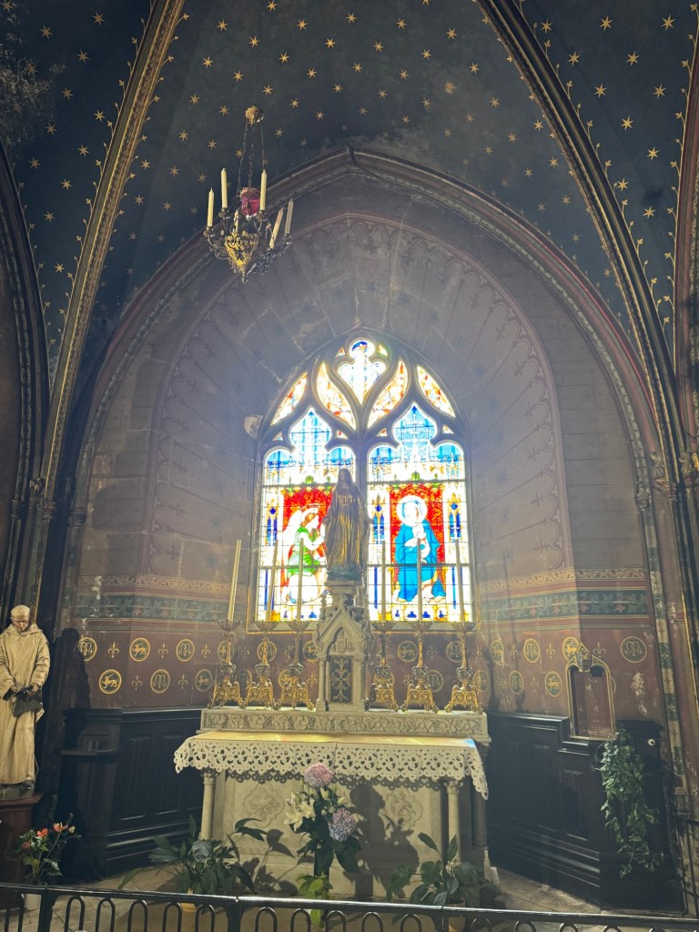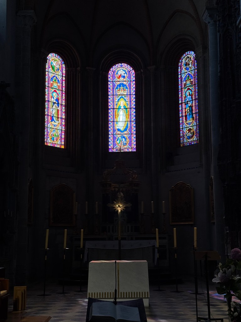 Ich komme zu einem gutem Moment: die Sonne scheint direkt in einer Achse mit dem Mittelgang durch das Buntglas-Triptychon hinter dem Altarraum, die Fenster strahlen und tauchen den vorderen Kirchenbereich in buntes Licht. Ich wandere ein wenig umher, gucke mir die Statuen und Inschriften an, genieße die Kühle und Stille des riesigen Raumes.