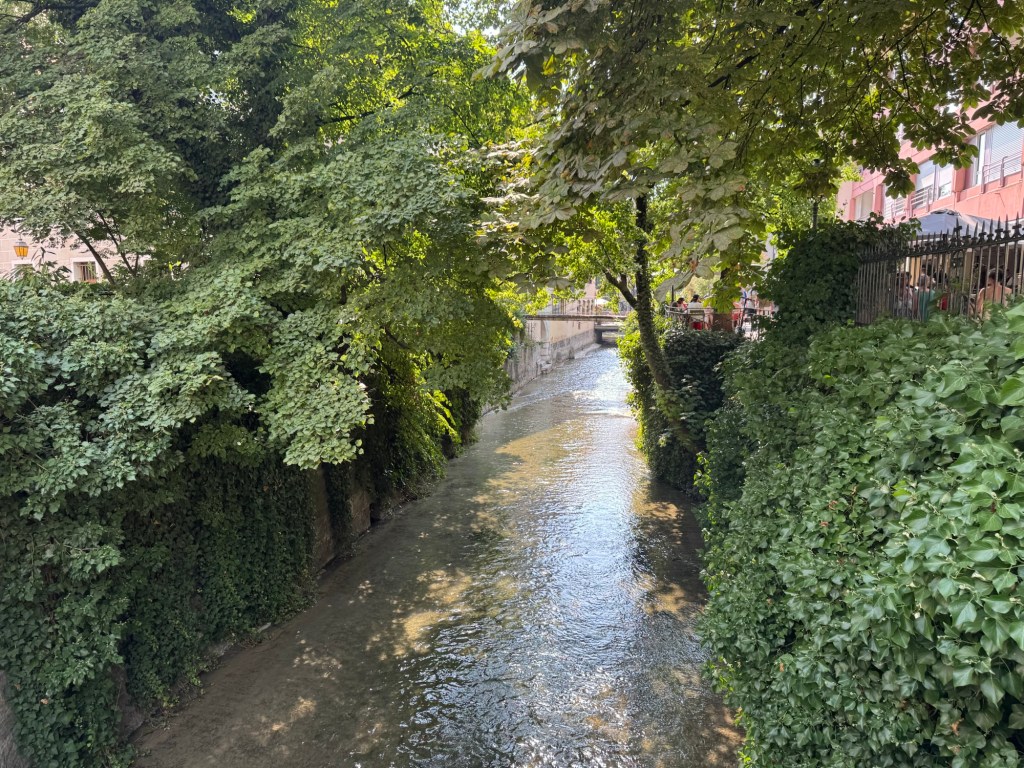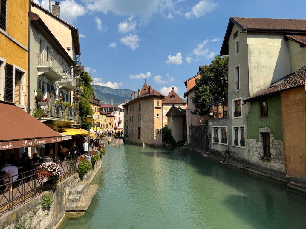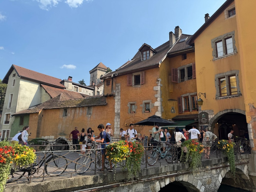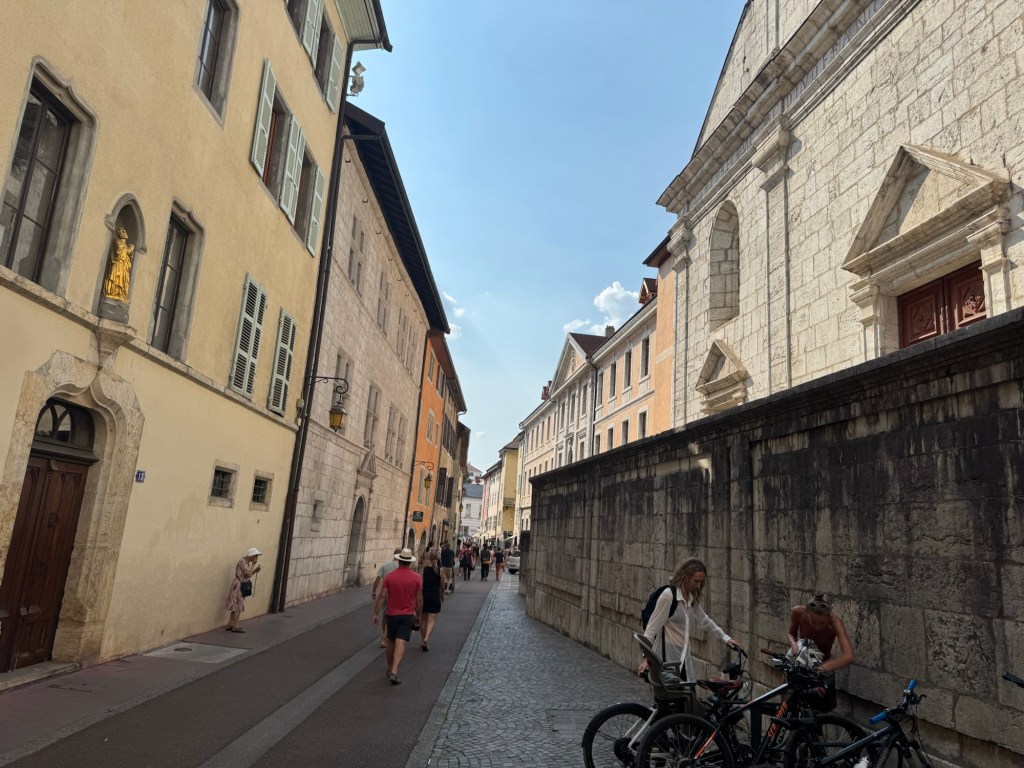 Insgesamt also eine Stadt, deren Spirit eher als reaktionär bezeichnet werden kann. Konsequent durch die Jahrhunderte gelebt. Wir sind vor allem hier, weil es als „Venedig der Alpen“ angepriesen wird, und ein bisschen Vibes hat die Stadt durchaus. Die Stadt liegt am Lac d´Annecy, dieser entwässert über den Fluss Thiou über mehrere Kanäle quer durch die Stadt. Ergebnis sind Häuser direkt am Wasser und viele Brücken. Viele tolle Fotomotive also, sehr viel instagram-taugliches Material das unendliche Menschenmassen mitnehmen wollen. Wir quetschen uns so durch, besichtigen Altstadt und Kathedrale. Die Altstadt mit ausschließlich mittelalterlicher Bausubstanz ist voll mit Eisläden und Touri-Nepp. Vor jedem Eisladen stehen die Menschen in Schlange, 30-40 Leute pro Eisladen mindestens. Bei den gut bewerteten mehr. Es ist ein Schieben und ein Drängeln bei 30 Grad.