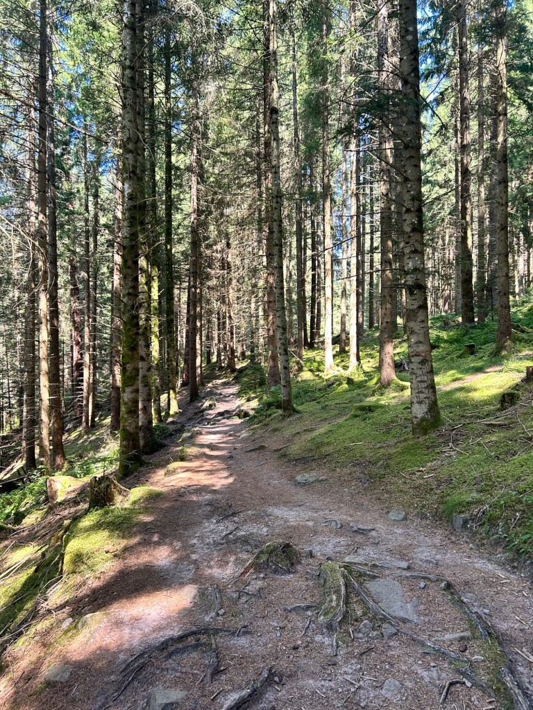 Über eine Wildwiese geht unser Weg auf die andere Seite des Tals, ein kleines Gasthaus wartet hier auf uns. Anders als bisher erlebt hat es auf, wir werden supernett begrüßt, bestellen uns ein paar ordentlich zischende Kaltgetränke und dazu Kuchen und einen Eisbecher. Eigentlich hatten wir geplant, hier zu Mittag zu essen – wir sind aber beide noch völlig gesättigt vom Frühstück. Mit vollem Bauch und gutem Zuckerspiegel gehen wir das letzte Drittel der Wanderung zurück zum Auto.