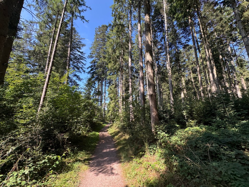 Bevor wir zurück nach Villingen-Schwenningen fahren, machen wir noch einen kleinen Abstecher in den Doniswald bei Königsfeld im Schwarzwald. Hier sind die Eichhörnchen angeblich so zutraulich, dass sie einem aus der Handfressen sollen. Der Wald und seine Wege sind sehr barrierefrei angelegt, das Ganze scheint eine Art Kurort oder ähnliches zu sein, es gibt Markierungen am Wegesrand, die zeigen, wie fit man ist wenn man es in 6 Minuten bis zu dieser Markierung geschafft hat. Wir liegen im Bereich „es gibt keine Markierung mehr für uns“ und laufen ein bisschen durch den Wald. Wir sehen ein, zwei Eichhörnchen, diese huschen tatsächlich sehr nah und unbeeindruckt an uns vorbei – auf Tuchfühlung gehen sie mit uns aber nicht. Ist auch okay, die Gewöhnung von Wildtieren an Menschen ist jetzt eh nicht sooo cool.